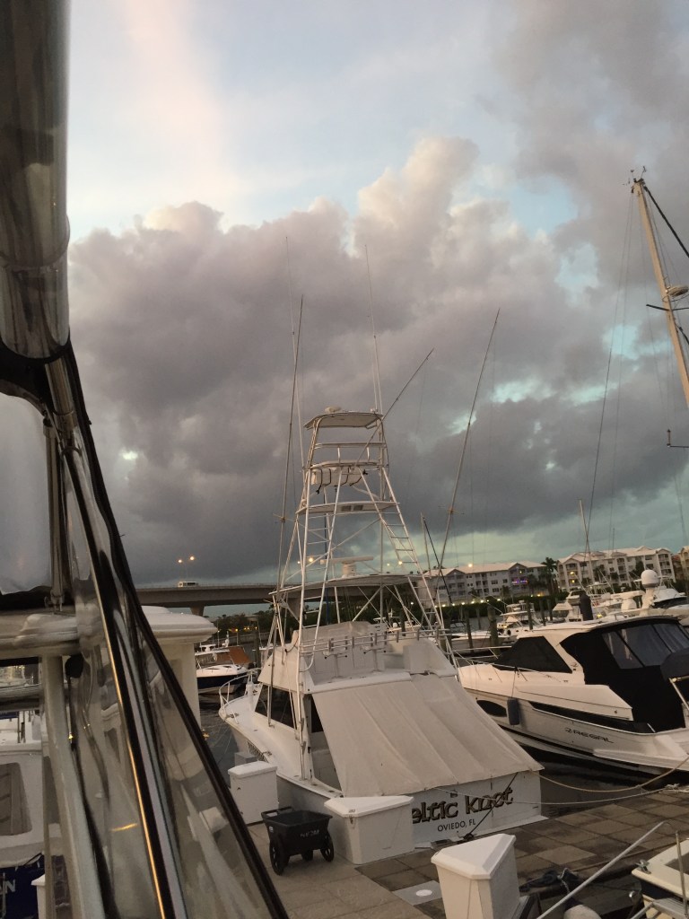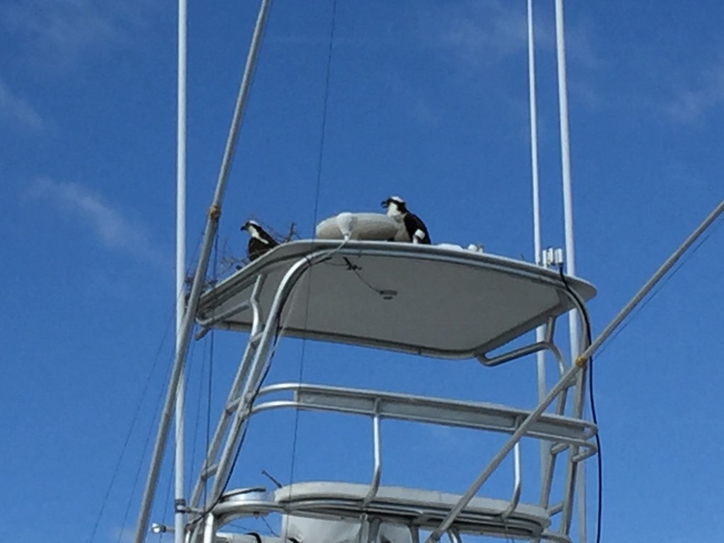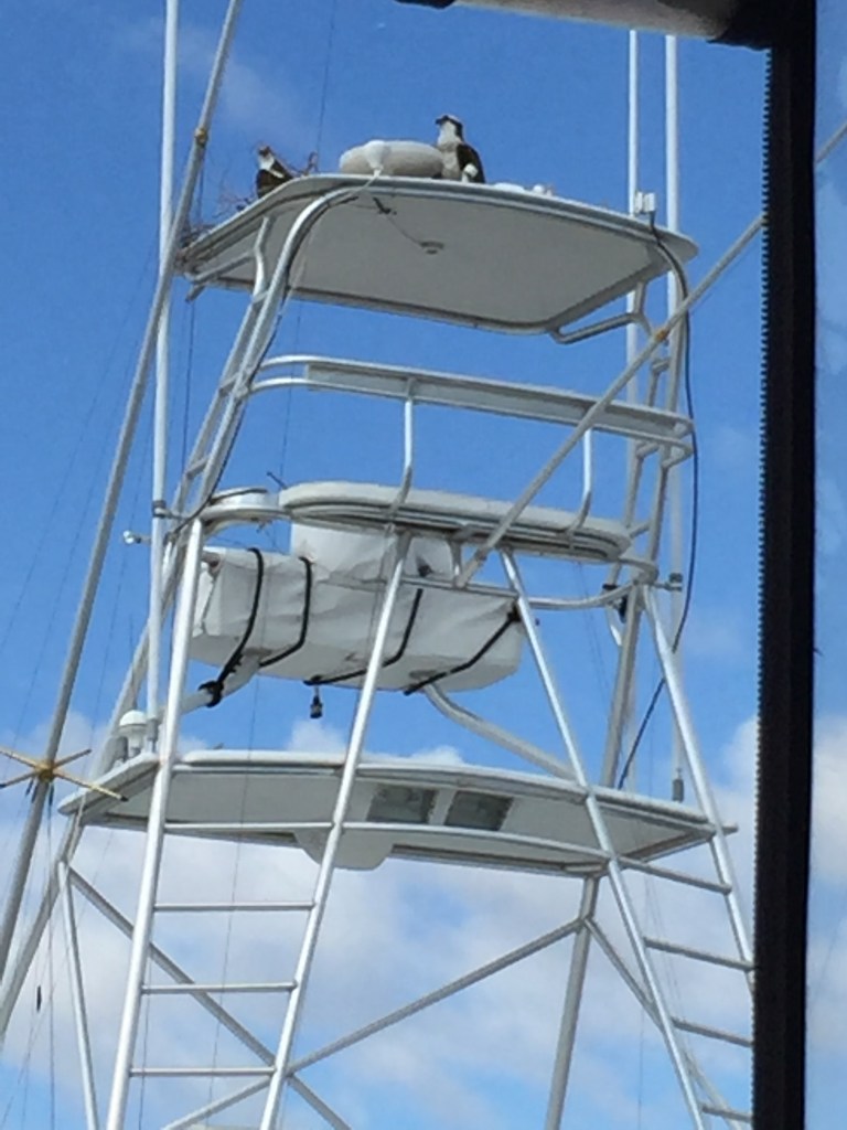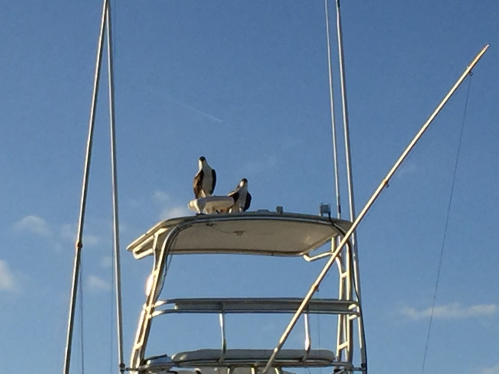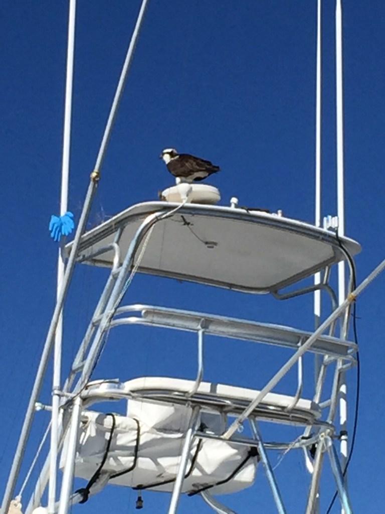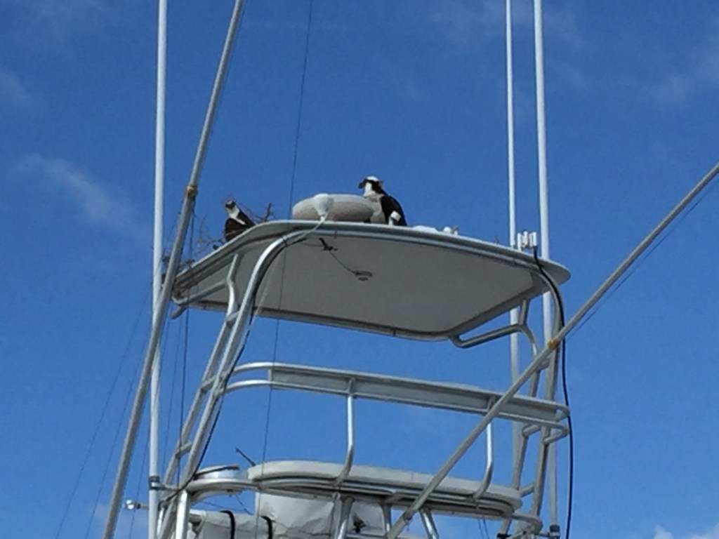 During our stay in Stuart, we observed a pair of Osprey’s making a nest on top of a boat across from us. The boat was up for sale and no one was living on it. The broker came and took the nest down and then the very next morning the Osprey’s would begin to make their nest again. We watched this for a couple weeks. The broker then decided to add blue gloves to some string to try to keep the pair off the boat. BUT….it did not work! This was too funny to watch.