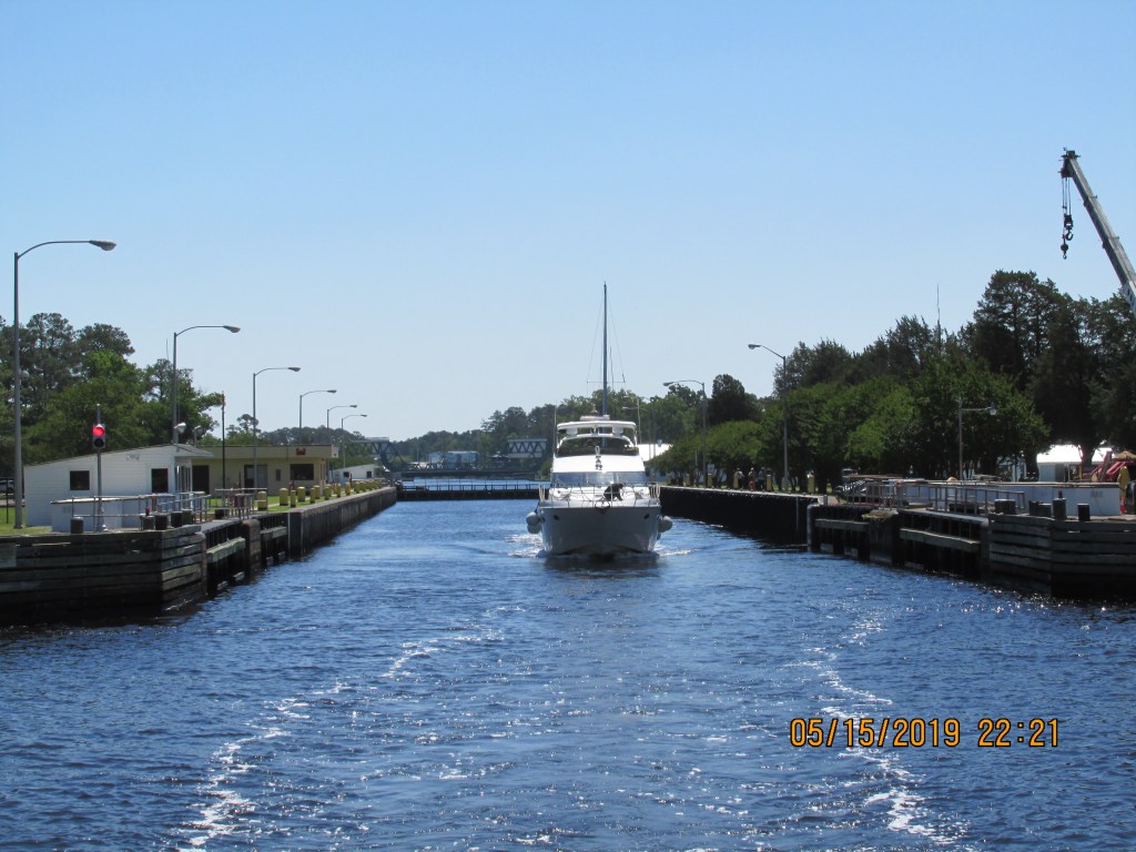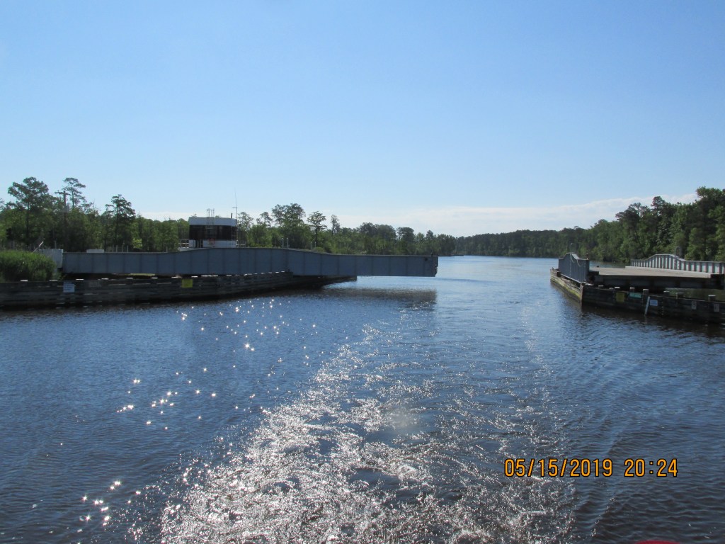 The next day we left a little later in the morning so the sun would not be in our eyes as we had to keep an eye out for numerous crab pots. We were traveling 55 miles to Coinjock Marina. As we motored across the sound the starboard engine kept losing RPM’s – we decided to drop anchor and go below and change the fuel filter. This effort helped but did not resolve the issue, so we limped along to Coinjock. At Coinjock they had a good selection of filters so we purchase inline filters and changed them and have our fingers crossed that this will work the next day.