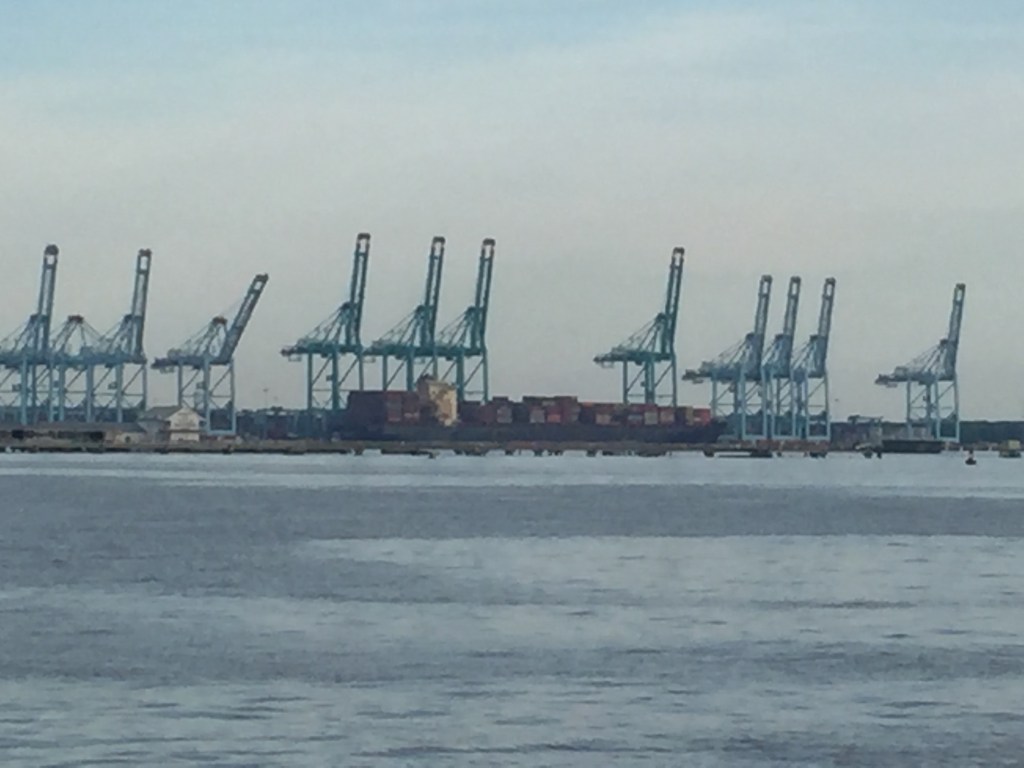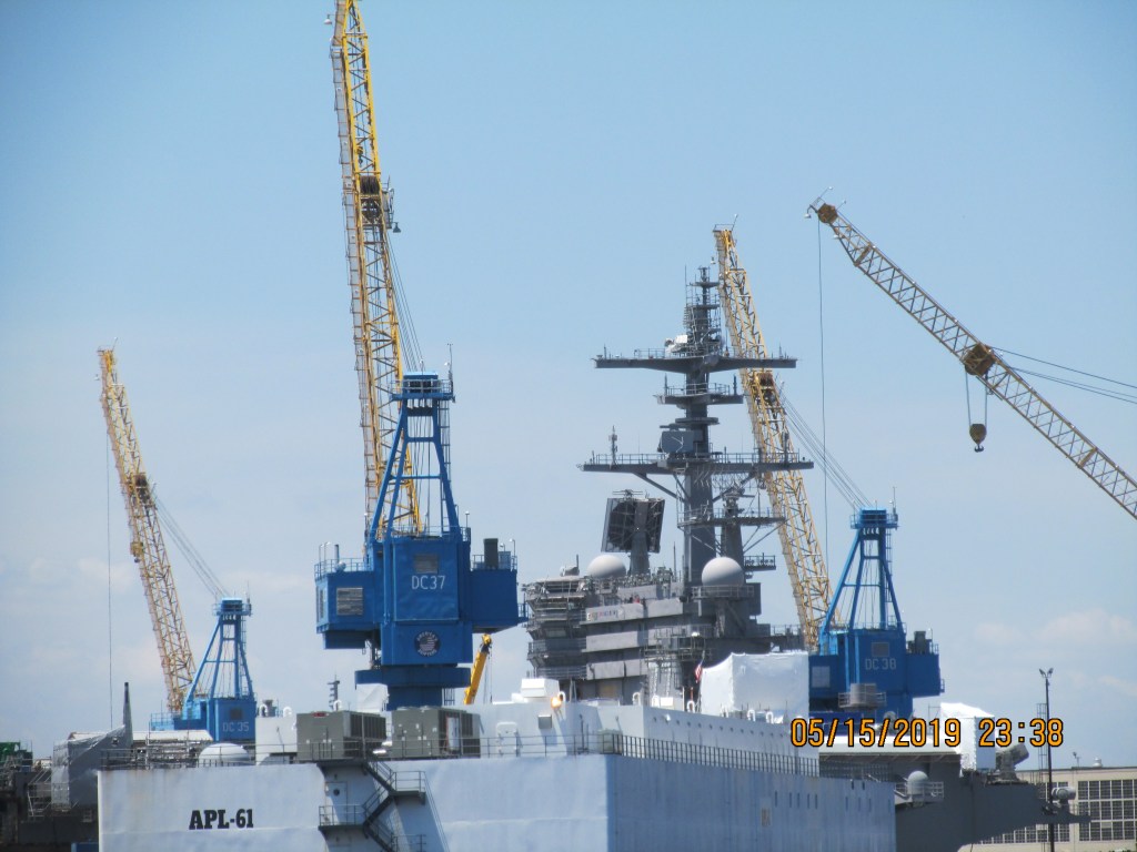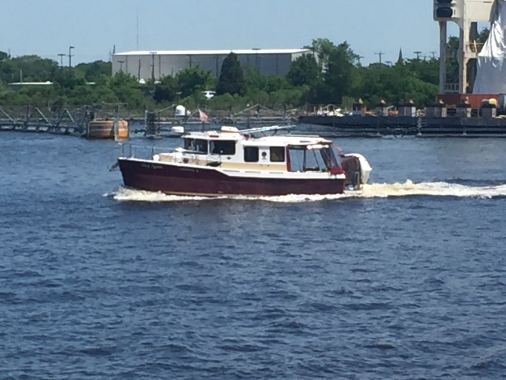 We pushed off at 7AM and were headed out to Chesapeake Bay to the York River. The engine repair seems to have worked. We traveled through Newport New and saw many naval ships. We passed a naval base just in time to hear them play the National Anthem. We stood and put our hands on our heart as we went by. The Chesapeake Bay was calm we had 3 mph winds and the waves were less than 1 foot. Since it was a Friday there were not many pleasure boaters and we did not run into any commercial traffic.