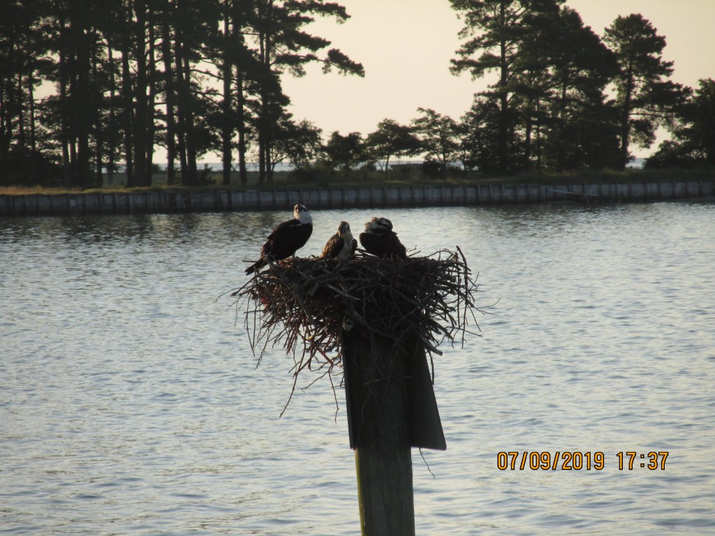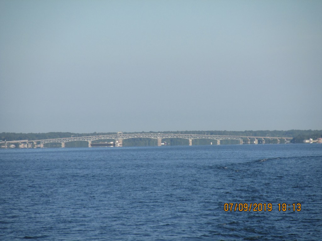 As we cruised out to the bay we got one last look at the bridge and some ospreys. We also saw a light house at the end of Mojack Bay. The water was calm and it was a beautiful day. The marina we selected was a small one. We pulled in to refuel and pump out our waste tank. The fuel pump was broken and they wanted $25 for a pump out! We passed on both after it took 15 minutes to pump 6 gallons of fuel and just paid for our slip. We had a nice quiet night.