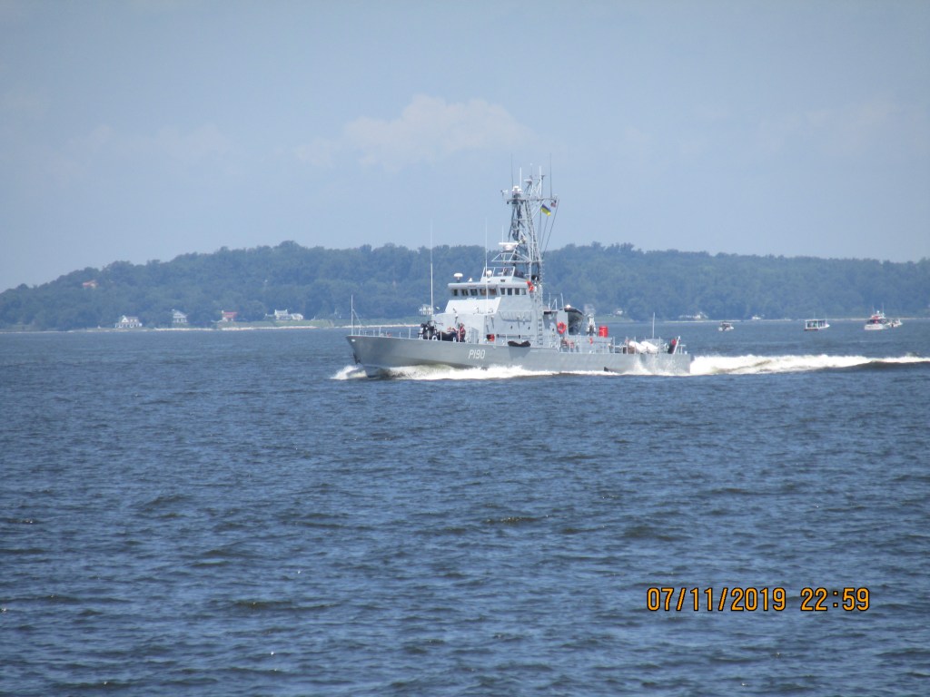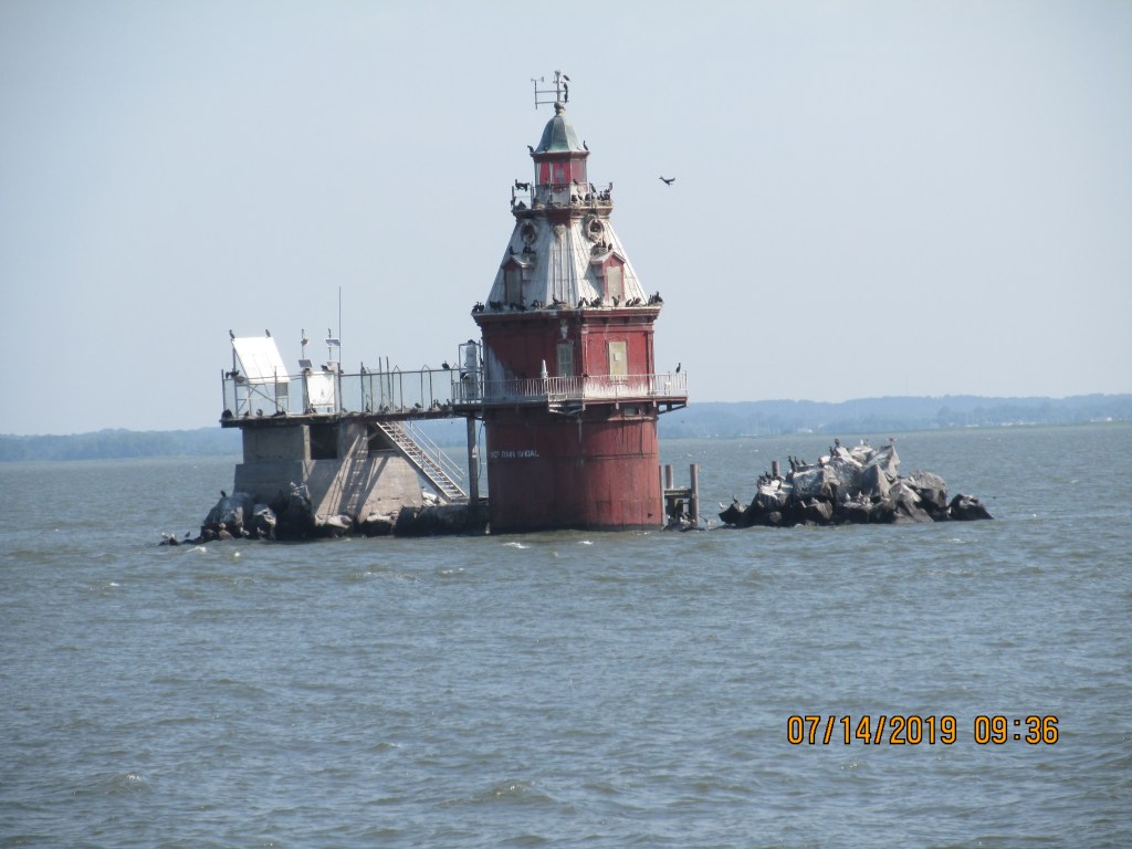 This morning we followed this fishing boat out of the harbor. We saw three commercial cargo ships today. They were moving amazingly fast at 18 to 20 mph, so we had to make sure we stayed out of their way. We motored up pass Annapolis, MD to a place called Rockhall, MD. Along the way we saw a number of small light houses and sail boats out enjoying the nice day.