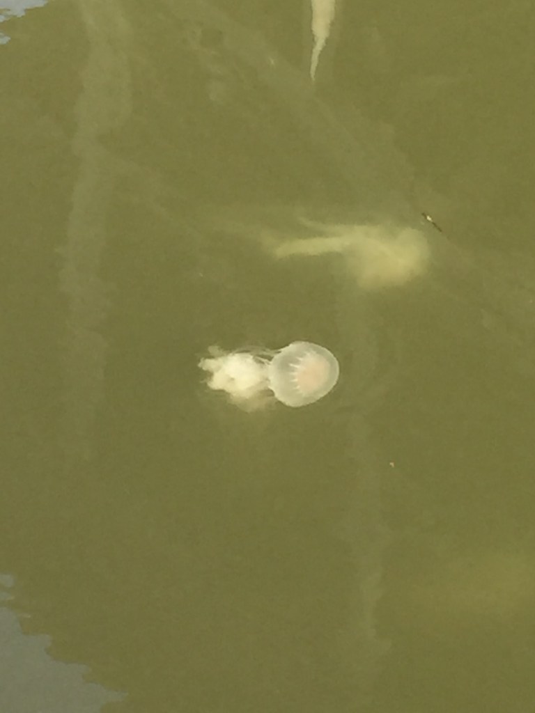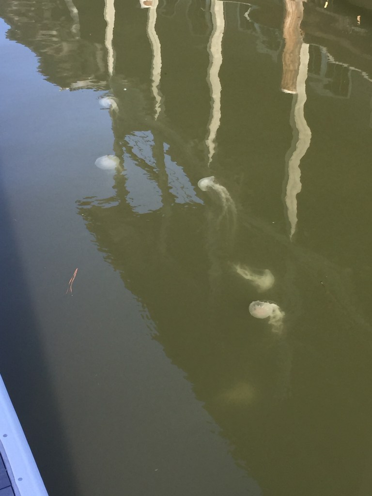 The marina had these jelly fish everywhere. They said that you could get one in your strainers so to be sure to have gloves in case this happened.
