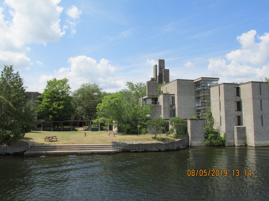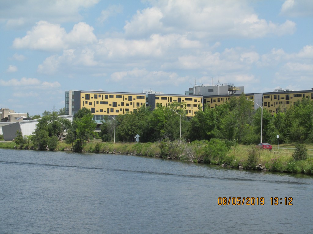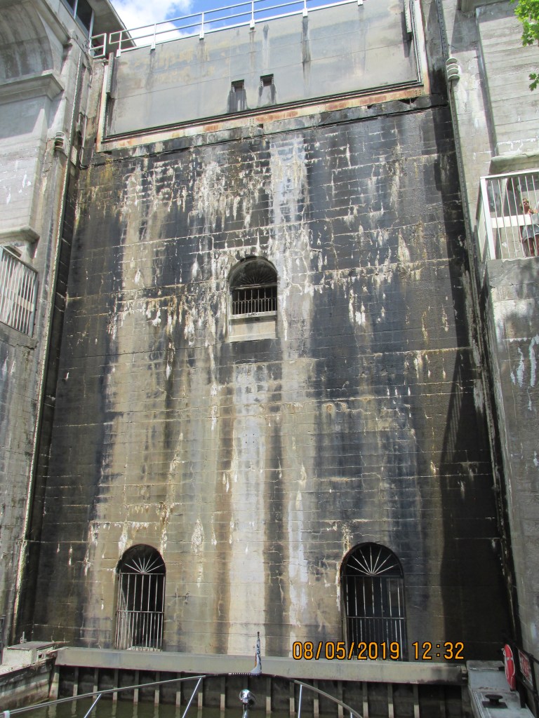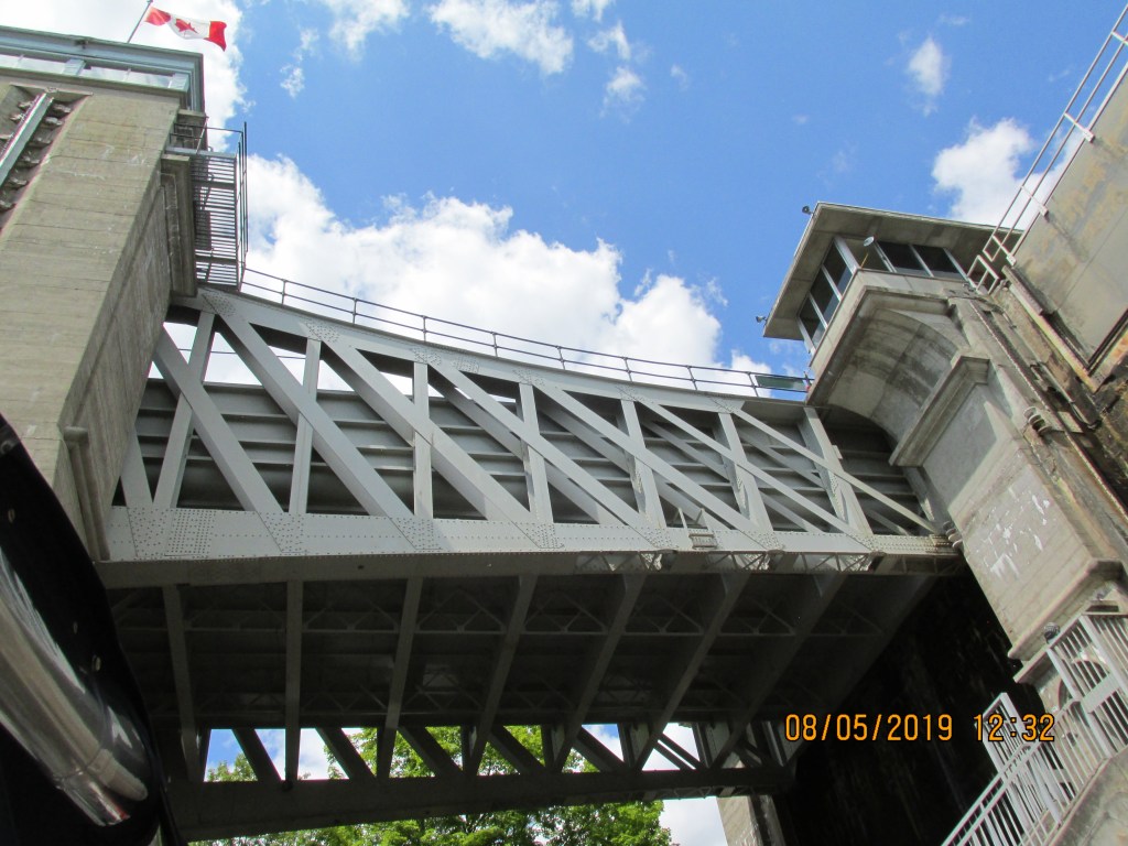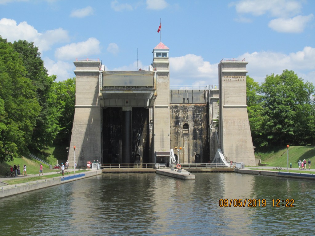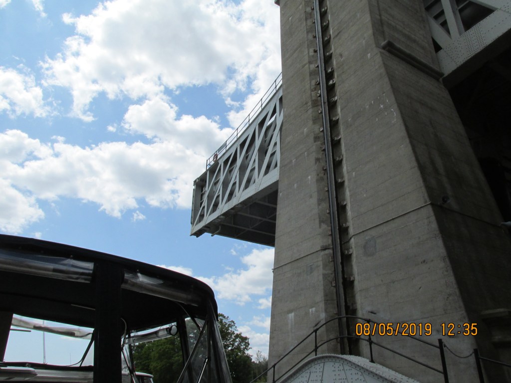 Peterborough Lift (Lock #21) is the world’s highest hydraulic pan lift lock. We floated up the 65-foot vertical lift in a pan (tub) full of water! The lift lock was completed in 1904. Each of the two pans weighs 1300 tons when filled. With one pan up and the other one down the two balance each other. A boat displaces it won weight in water. When it is time to lower one pan and raise the other, one extra foot of water (130 tons) is allowed ot enter the upper pan. This extra weight allows the upper pan to push down and raise the lower pan to the top level. The two pans are locked in place and the extra water is let out of the lower pan. Boats enter and exit the upper and lower pans and the process is repeated in reverse. Yea, floating in the air was a weird feeling.