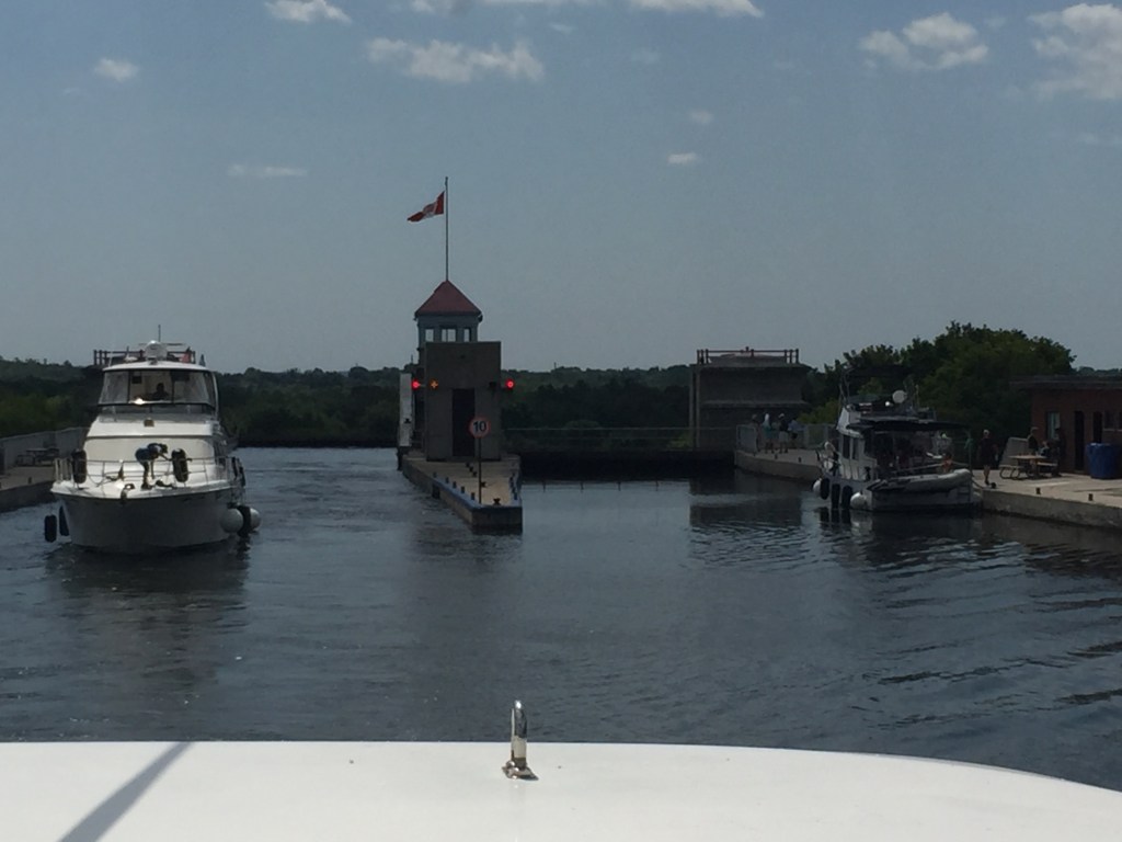 We traveled 10 miles today and went through 7 more locks which took us 5.5 hours to complete. Yup averaged 2 miles per hour! We waited until 11 AM to leave since we saw a number of boats leave to go through the locks. This gave us time to go to the grocery and visit a boating store before we left Peterborough. We had to wait on a few downstream boats before we could get through lock #20. This was because the lift lock was having some electrical issues and this backed up a few boats.