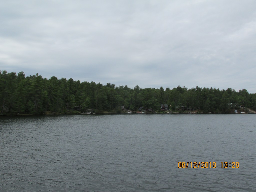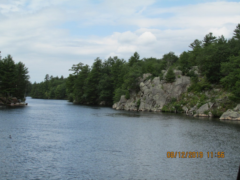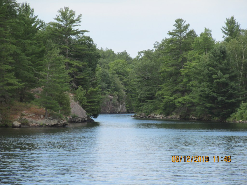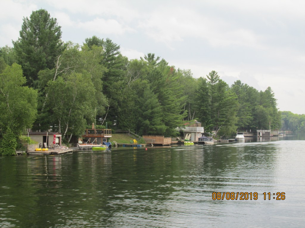 The area we cruised through was nice and green with pine trees. There were many cottages and everyone had docks and boats. Glad it was a Monday so we did not have as much traffic. There were a few narrow areas that we had to take care passing through. We were in the Severn River so the water was deeper here, but you still had to watch out for rocks.