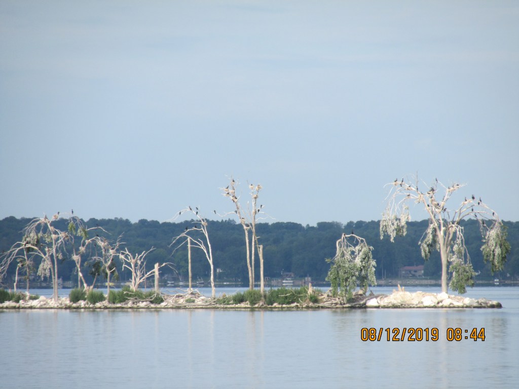 As we left the marina we noticed this white island. Upon closer observation we decided it was a bird nesting site and the white was bird droppings. They will nest here until they kill the trees then move on to another location.