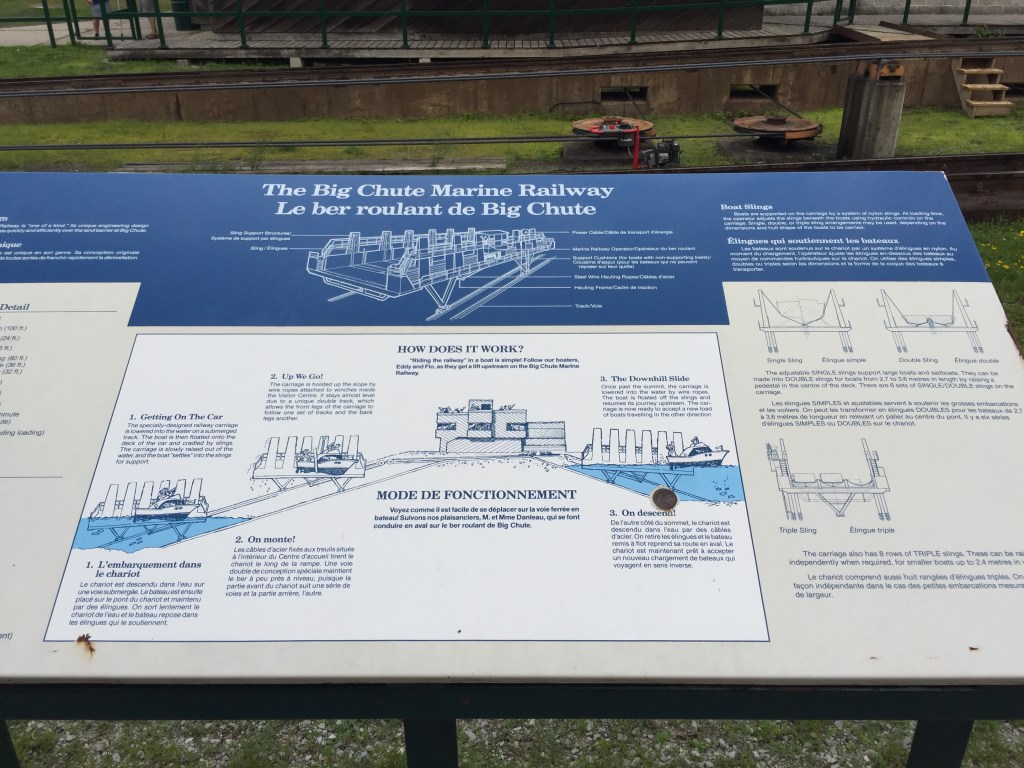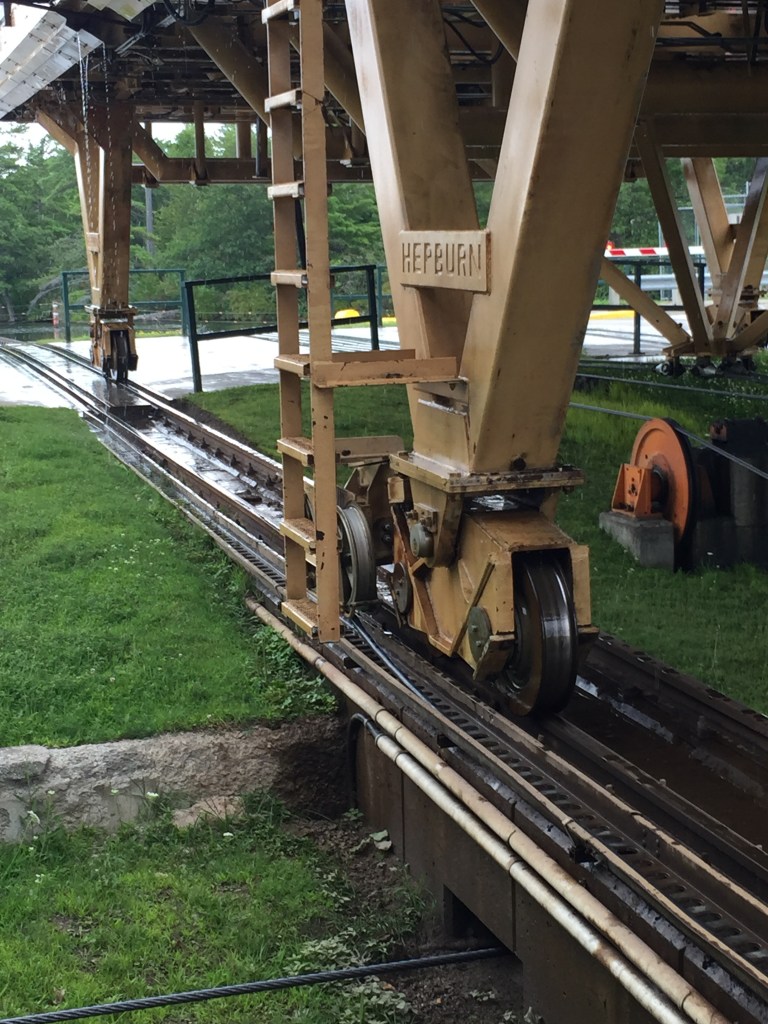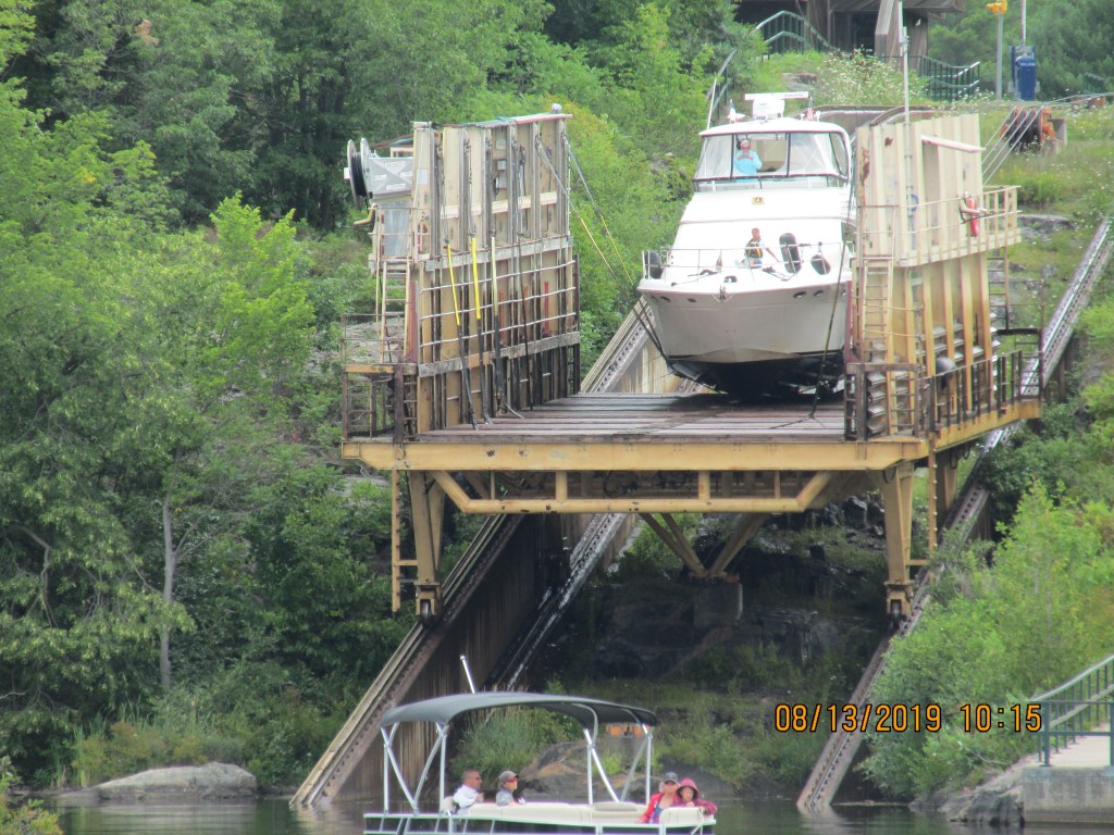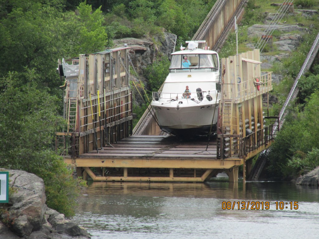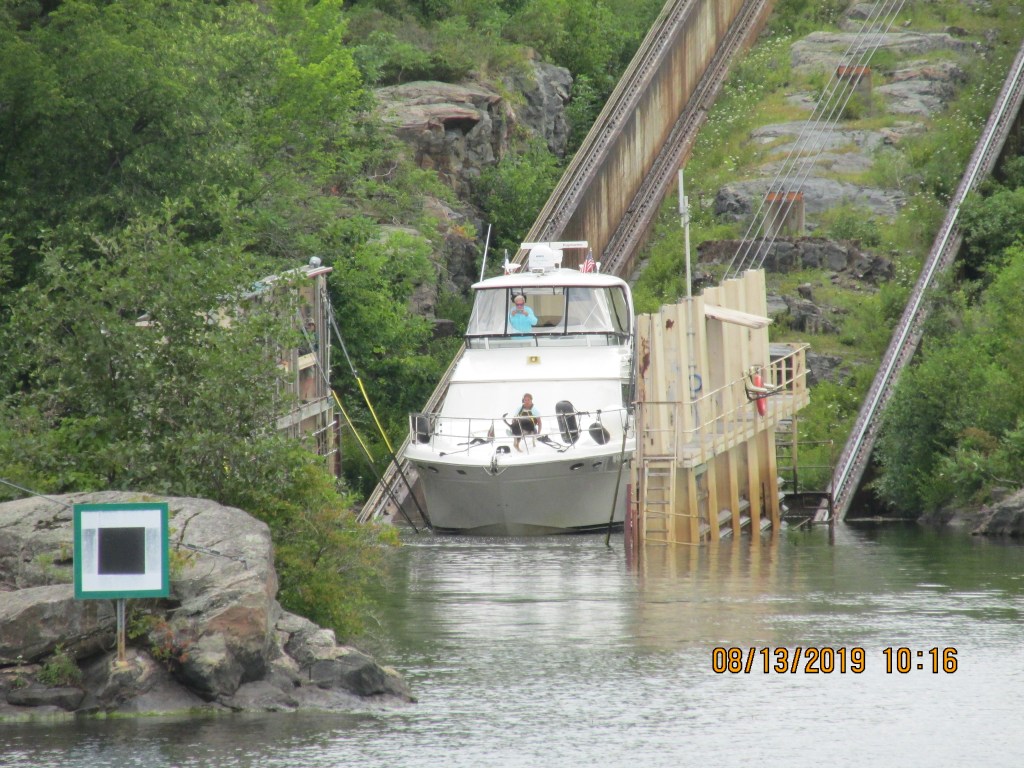 We awoke fresh to start the day. There were 4 boats already waiting to go through the “Big Chute” so we pushed off at about 9:45 AM to head to the blue line and await to be called by the lock master. We floated onto the platform and they pulled straps up to support the boat. Our running gear hung out over the back of the platform. It was a bit funny, as we noticed that they had a small notebook with all types of boats in it that had hand written information about where to place the straps for each boat model. We were the only boat on the lift. Then it started to up the railway and over land. Janis sat out on the front of the boat to see the trip first hand. Pretty cool. It was not a scary as you would think. We were placed into the water again and they told us when to start the engines and motor out from the platform.