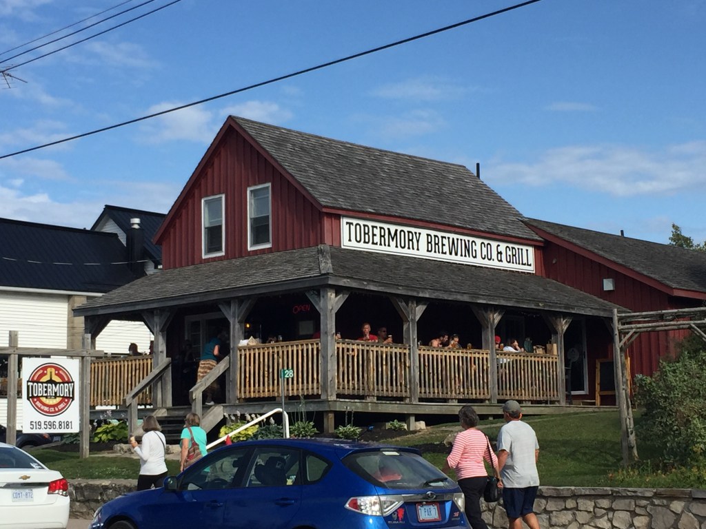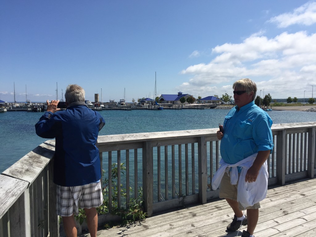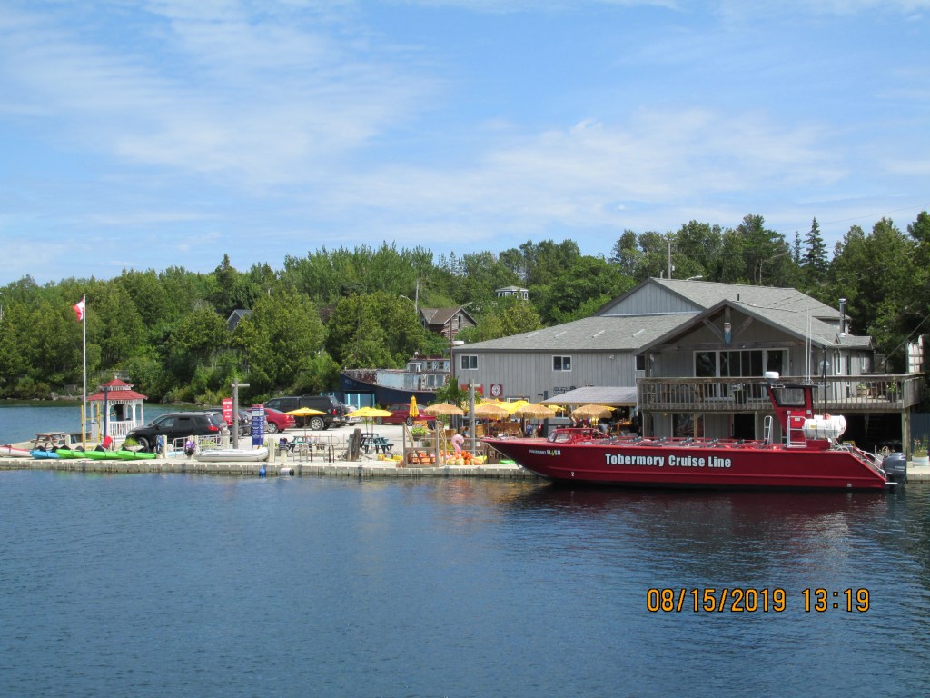We discussed the different routes we could take to go across Georgian Bay. From a time perspective, we felt that we could not follow the “Small Craft” Channel that takes you on the north side of the bay. We decided the best thing for us to do this trip was to cross the bay to Tobermory, ON. This would be a 90 mile trip across. Chris and I started out at 6AM so we could catch quite water first thing in the morning. We reached Tobermory at 1:30PM and refueled the boat. Then they put us on a wall that was basically downtown. We became an attraction. We felt a bit like animals in a zoo. Chris could not get back on our boat for a few minutes because people kept taking photos of themselves with our boat!