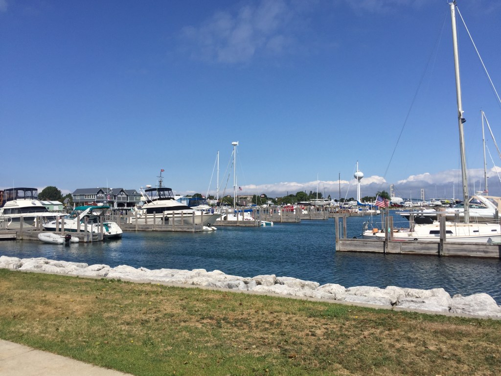 We reviewed the weather and had a few good days to begin our travel south on the east side of Lake Michigan. We went under the Mackinac Bridge and entered the Straits of Mackinac. The Mackinac Bridge is a suspension bridge spanning the Straits of Mackinac to connect the Upper and Lower Peninsulas of the U.S. state of Michigan. Opened in 1957, the 26,372-foot-long bridge is the world’s 22nd-longest main span and the longest suspension bridge between anchorages in the Western Hemisphere.